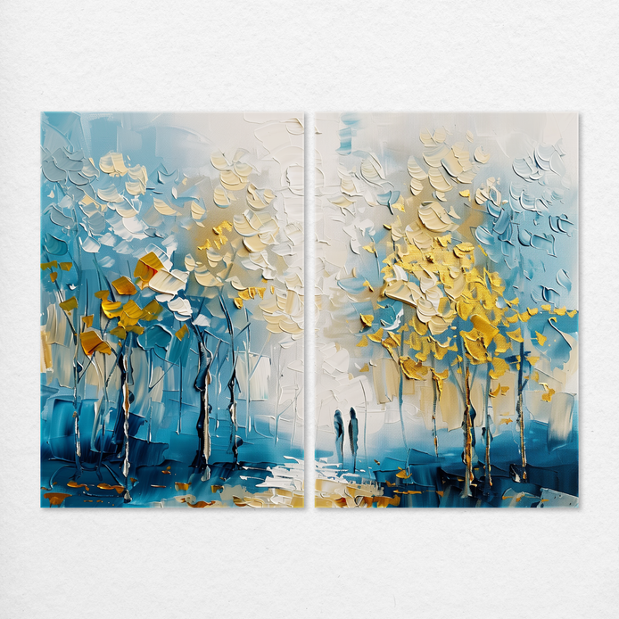 A secret moment unfolds as two figures walk beneath trees, conveying an intimate and serene mood. Cool blues and luminous golden hues define the composition, featuring delicate, textured blossoms. This piece is ideal for elevating the style of living rooms, offices, or bedrooms.