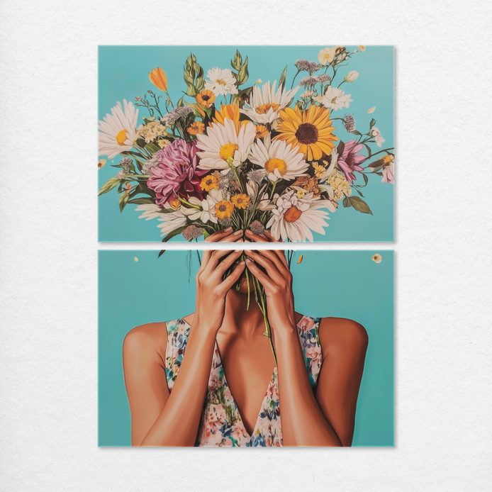 This vibrant composition celebrates nature’s unadulterated joy with a cheerful cascade of daisies, sunflowers, and other blooms. The vivid floral design, set against a bright turquoise background, exudes warmth and energetic flair. It is ideal for introducing stylish, colorful energy into living rooms, dining areas, or hallways.