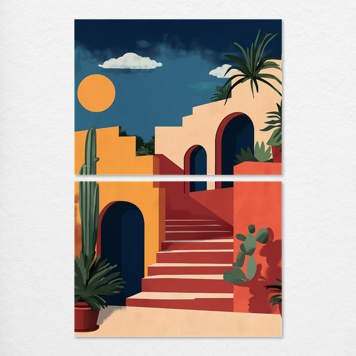 This vibrant visual captures Mediterranean architecture and lush greenery, evoking a serene summer escape filled with sunlit charm. The composition features bold forms and tropical accents rendered in a warm palette of yellow and lush hues. It is ideal for adding an airy mood to living rooms, bedrooms, or offices.