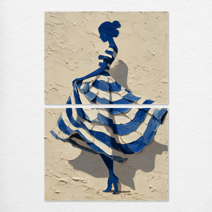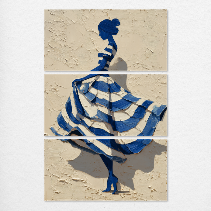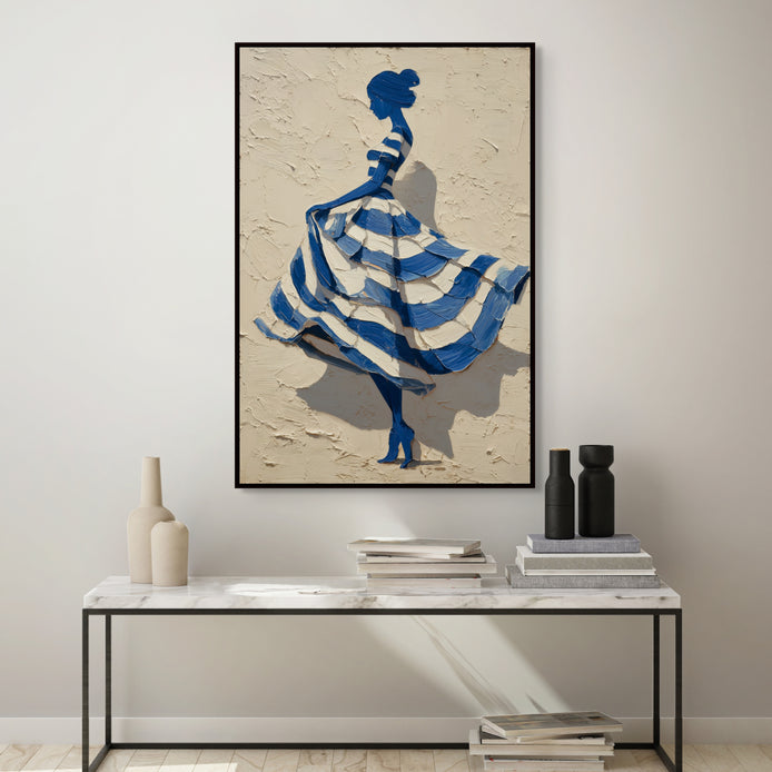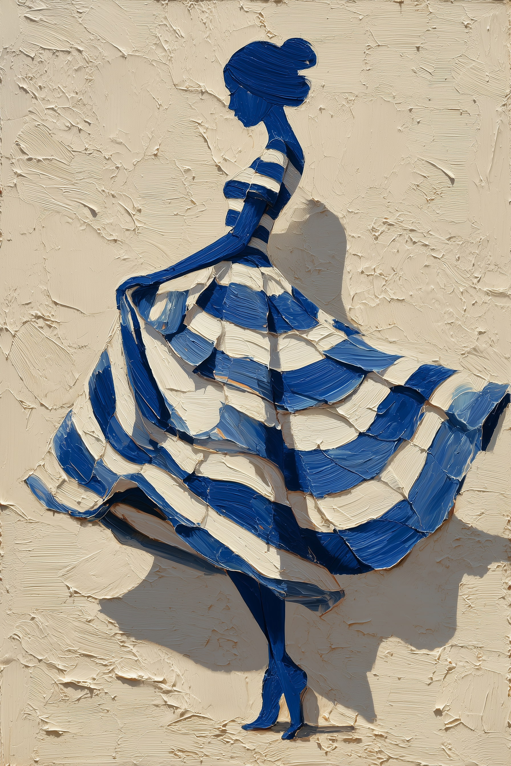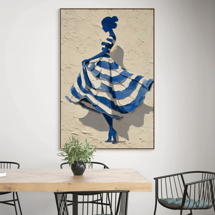 This striking hand-painted wall art features a graceful silhouette of a woman dressed in bold blue and white stripes. The unique texture and color contrast make it a captivating piece.