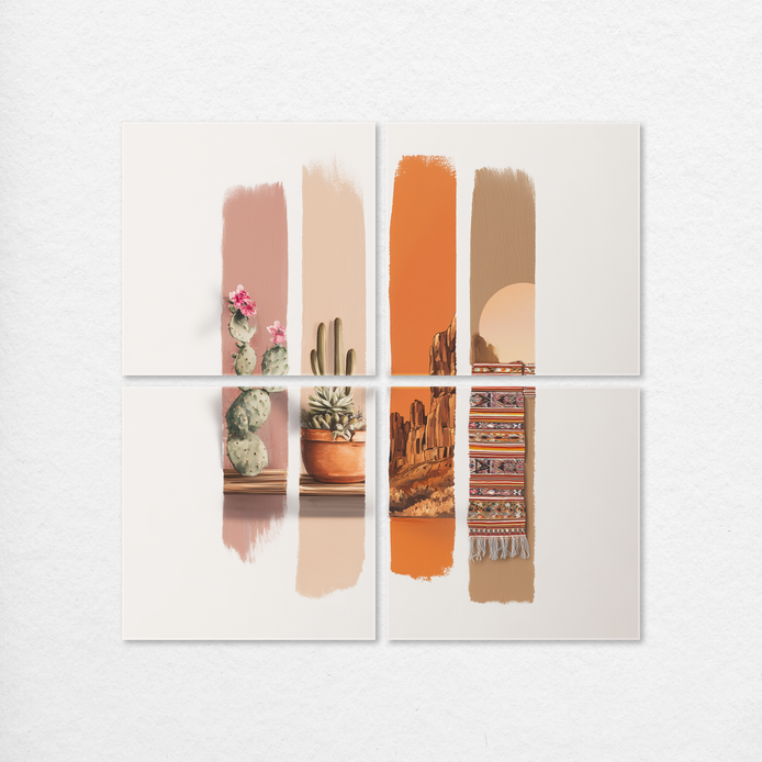 This captivating visual features a vibrant, natural arrangement of cacti and textures, instilling a warm desert mood. The composition combines natural textures with intricate, earth-toned patterns for a sophisticated, rustic design. This piece is ideal for elevating living rooms, dining areas, or even sophisticated patio spaces.