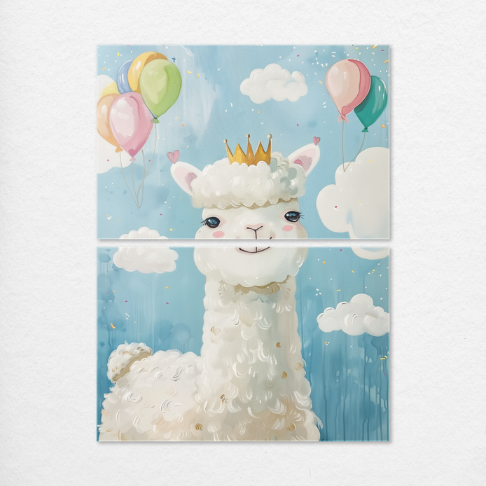 A fluffy alpaca, whimsically crowned in gold, exudes an uplifting mood fit for royalty and celebration. This maximalist composition showcases a lively sky scattered with colorful balloons and confetti for an energetic statement. It is an ideal piece for a child's room or an energizing addition to a living area.