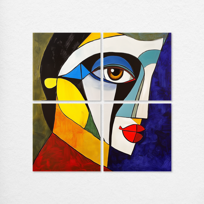 This captivating abstract portrait is defined by a bold and modern aesthetic. The geometric composition features vivid colors and compelling shapes that immediately captivate the viewer. It is an ideal statement piece for decorating living rooms, bedrooms, dining areas, hallways, or offices.