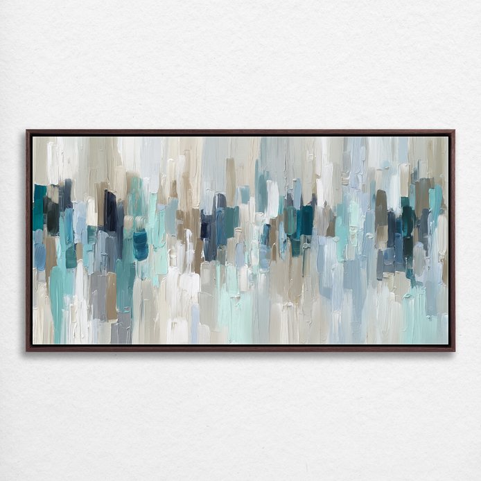 This abstract design evokes a serene, contemporary mood with its deep sense of tranquility and elegance. The composition features flowing lines and layered colors in a soothing palette of blue and beige, reflecting a sophisticated modern style. This piece is perfect for adding depth to a contemporary living room, bedroom, or office space.