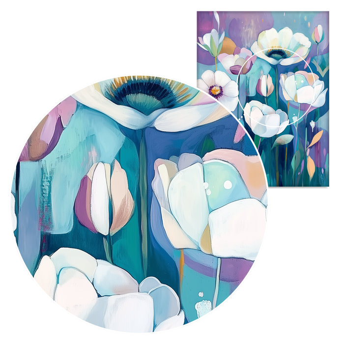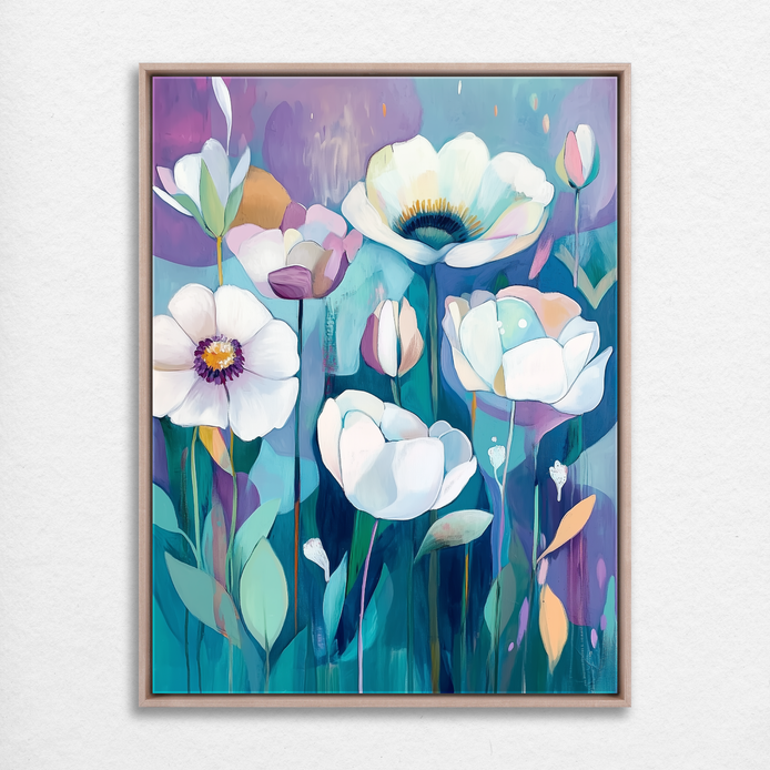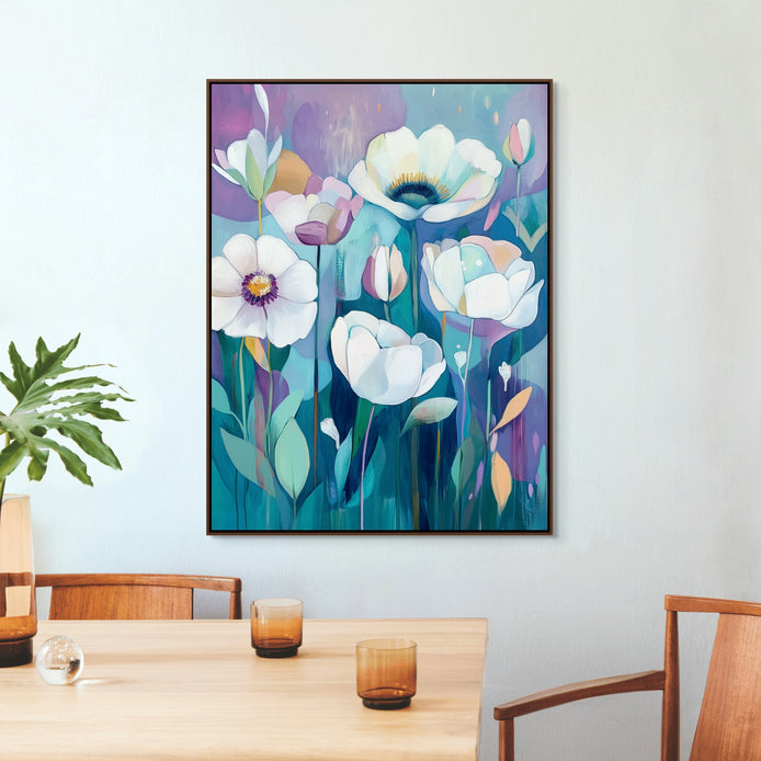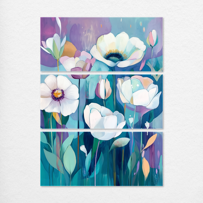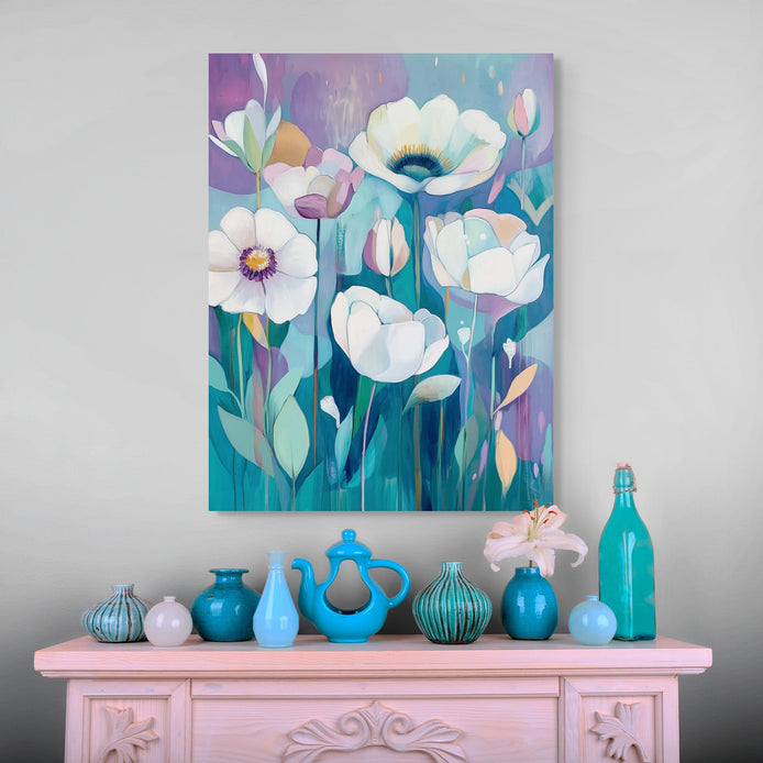An array of lively flowers establishes a fresh and inviting visual experience. The modern style composition utilizes bright colors and abstract shapes for a dynamic aesthetic. This visual is ideal for energizing living rooms, bedrooms, dining areas, hallways, or offices.