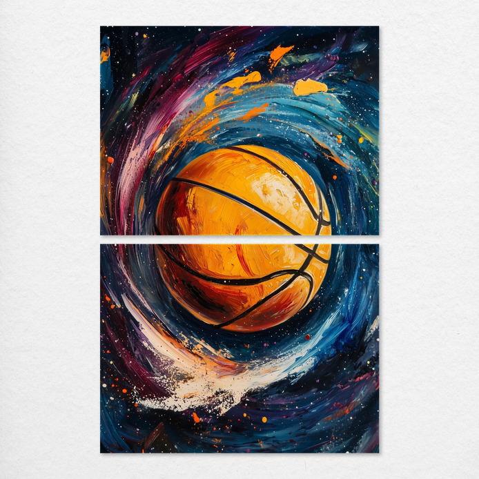 This striking hand-painted artwork captures a basketball spiraling through a colorful cosmic swirl, conveying the energy of sports.