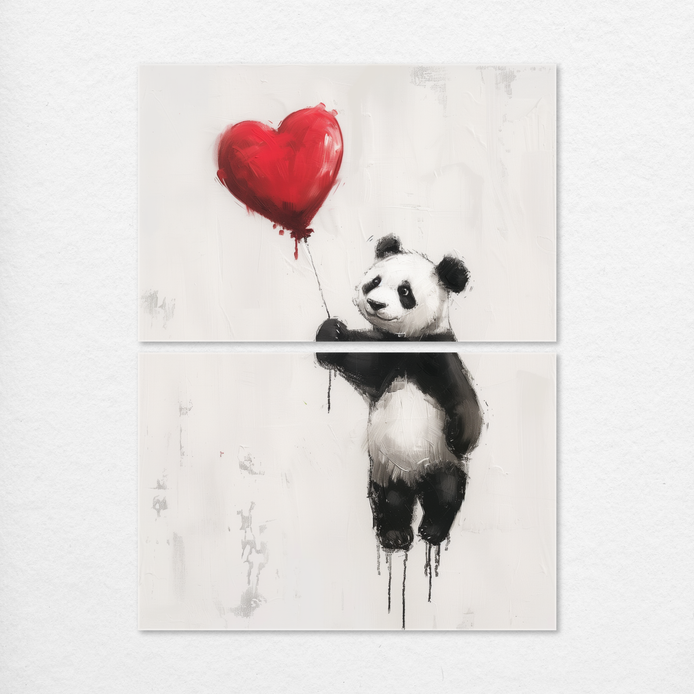 A charming black-and-white panda gently floats away, conveying a mood of whimsical emotion with a dripping red heart balloon. The composition utilizes a clean, minimalistic aesthetic and high-contrast color choices for a sophisticated visual appeal. This piece is ideal for adding a delightful atmosphere to bedrooms, kids' rooms, or casual living areas.