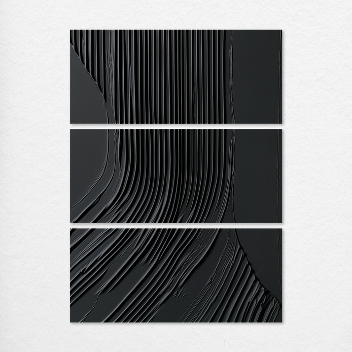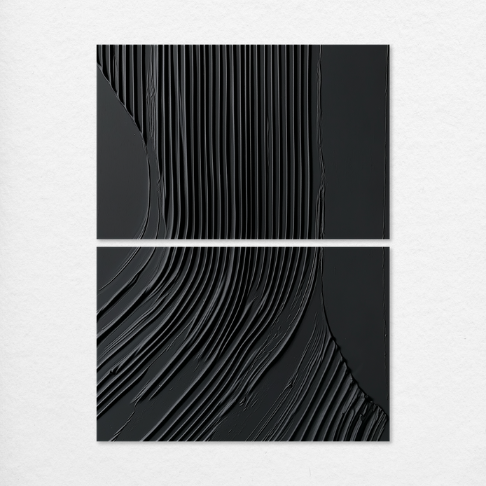 This monochromatic composition explores dramatic depth and mood through textured black curves and charcoal tones. The minimalist design achieves a perfect balance of intense drama and refined simplicity. It serves as a bold focal point for sophisticated modern interiors, including living rooms, bedrooms, and offices.