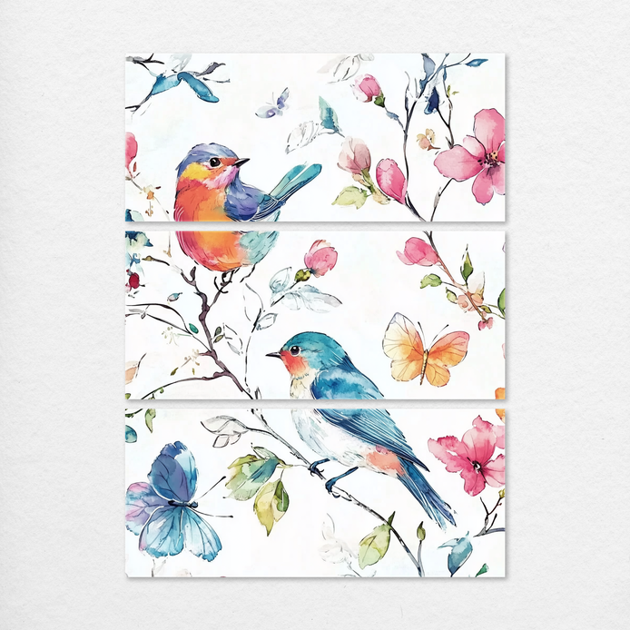 Vibrant birds among colorful blossoms and delicate butterflies create an atmosphere that is both joyful and serene. The lively composition features a maximalist arrangement of colorful flora, bringing energy and warmth to the scene. This piece is an ideal choice for enhancing a living room, bedroom, or dining area.