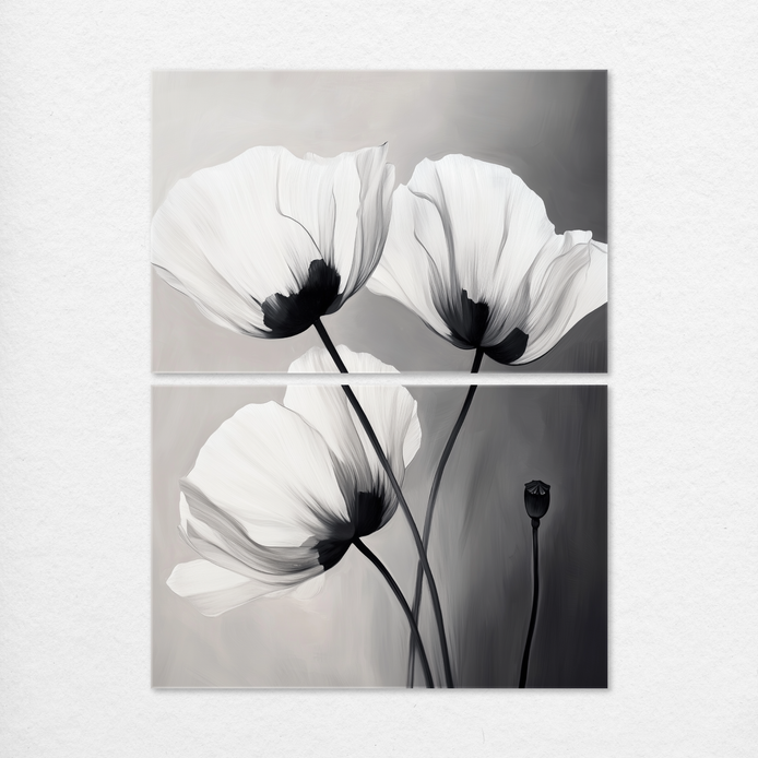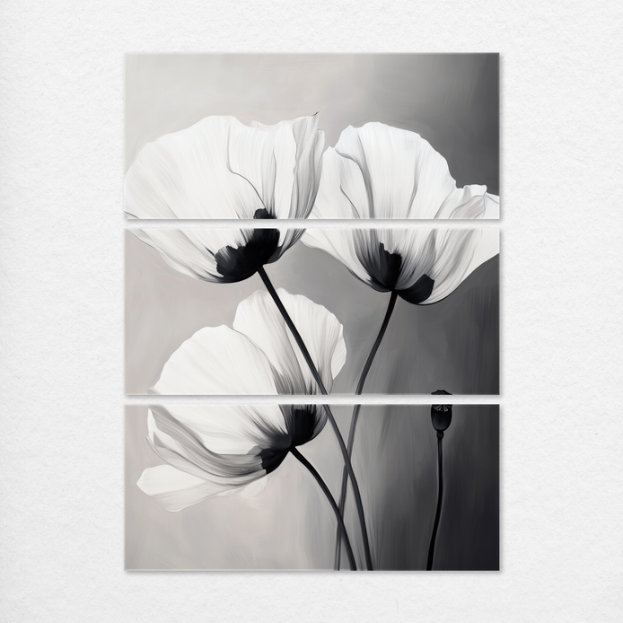 Delicate black and white poppies radiate quiet beauty and timeless elegance. The monochrome composition features refined detail, making it an ideal minimalist accent for sophisticated living rooms, bedrooms, or offices.