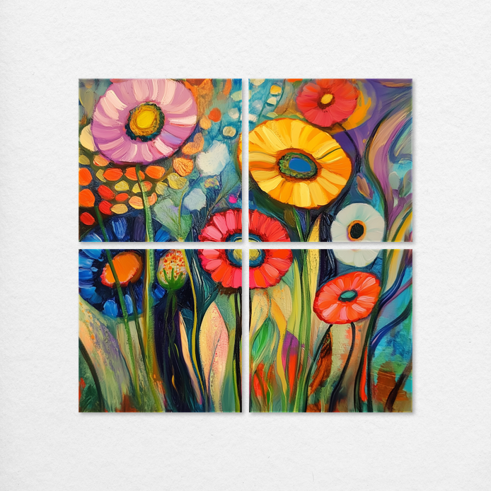 A masterpiece showcases a lively array of colorful flowers, bursting with energy and charm. This vibrant, maximalist composition adds a unique touch to any wall decor. Ideal for illuminating living rooms, bedrooms, dining areas, hallways, or kitchens.