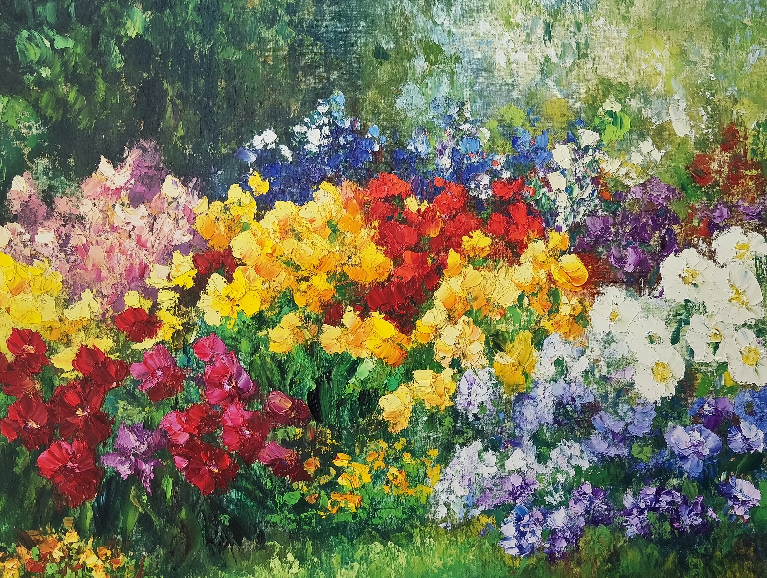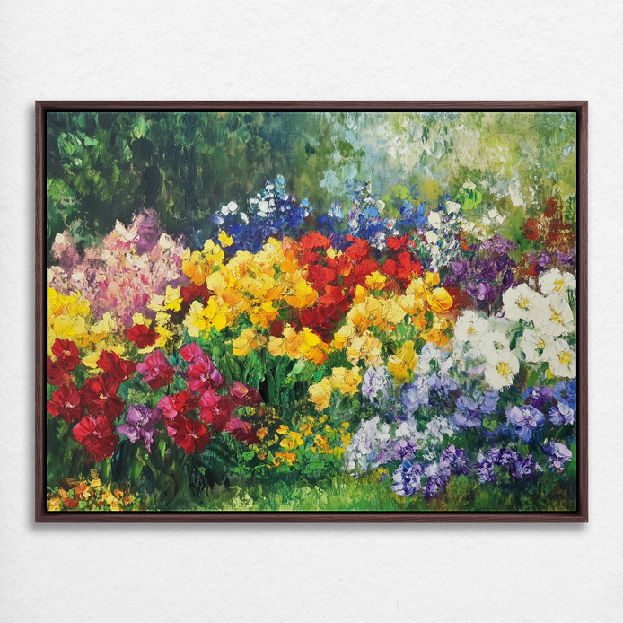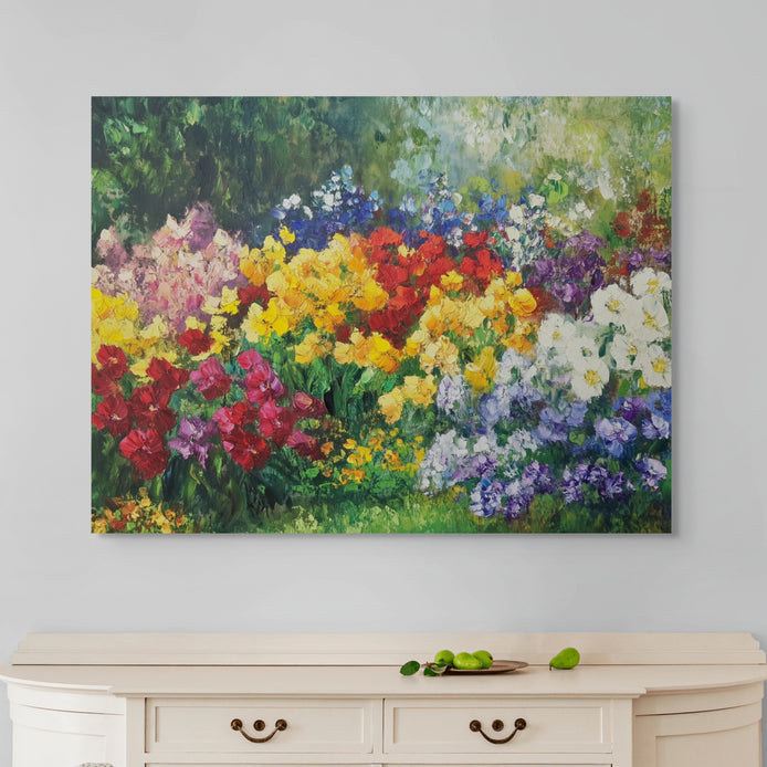 This hand-painted wall art showcases a vivid garden bursting with blossoms in various colors. The artwork captures the serene beauty of nature's blooms in a stunning display of creativity.