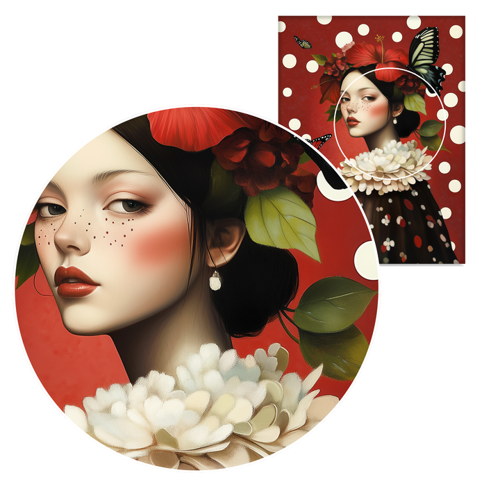 This whimsical and elegant portrait of a young woman adorned with a crown of flowers and butterflies blends spirited innocence with vibrant charm. The composition features intricate detail set against a playful, polka-dotted background, creating a maximalist and joyful aesthetic. This piece is an ideal statement for elevating living rooms, bedrooms, or offices.