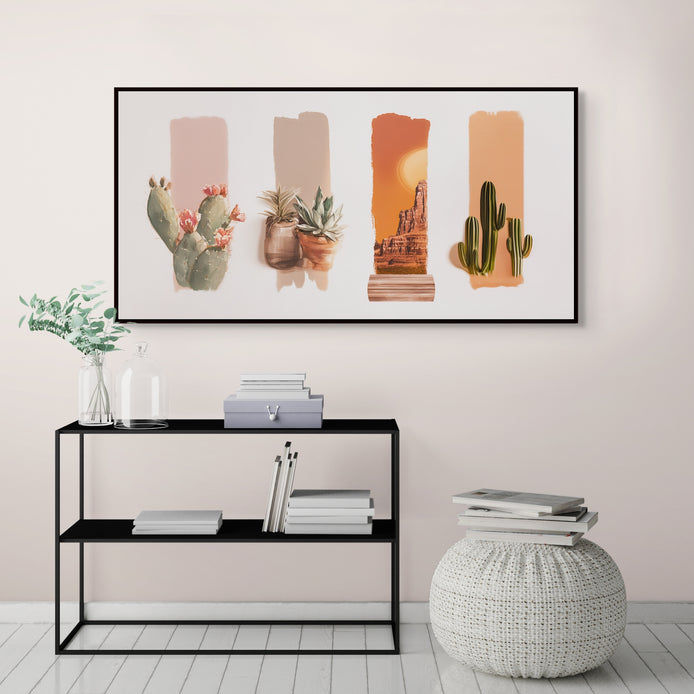 This hand-painted wall art features vibrant cacti and desert plants alongside a warm sunset, blending natural beauty with modern artistry. Each piece captures a unique essence of the Southwest.