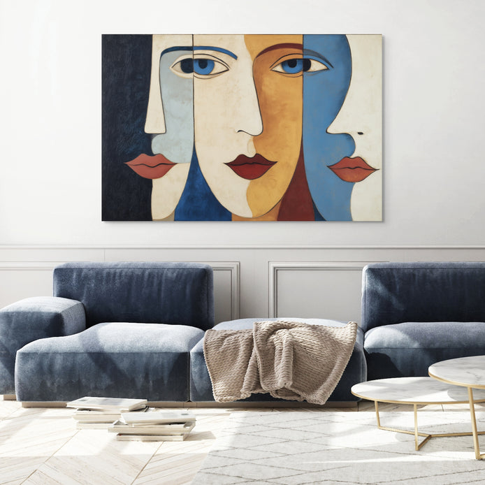 This hand-painted wall art showcases a striking composition of abstract faces with vivid colors, emphasizing contrasts in expression and style. Perfect for adding a contemporary touch to any decor.