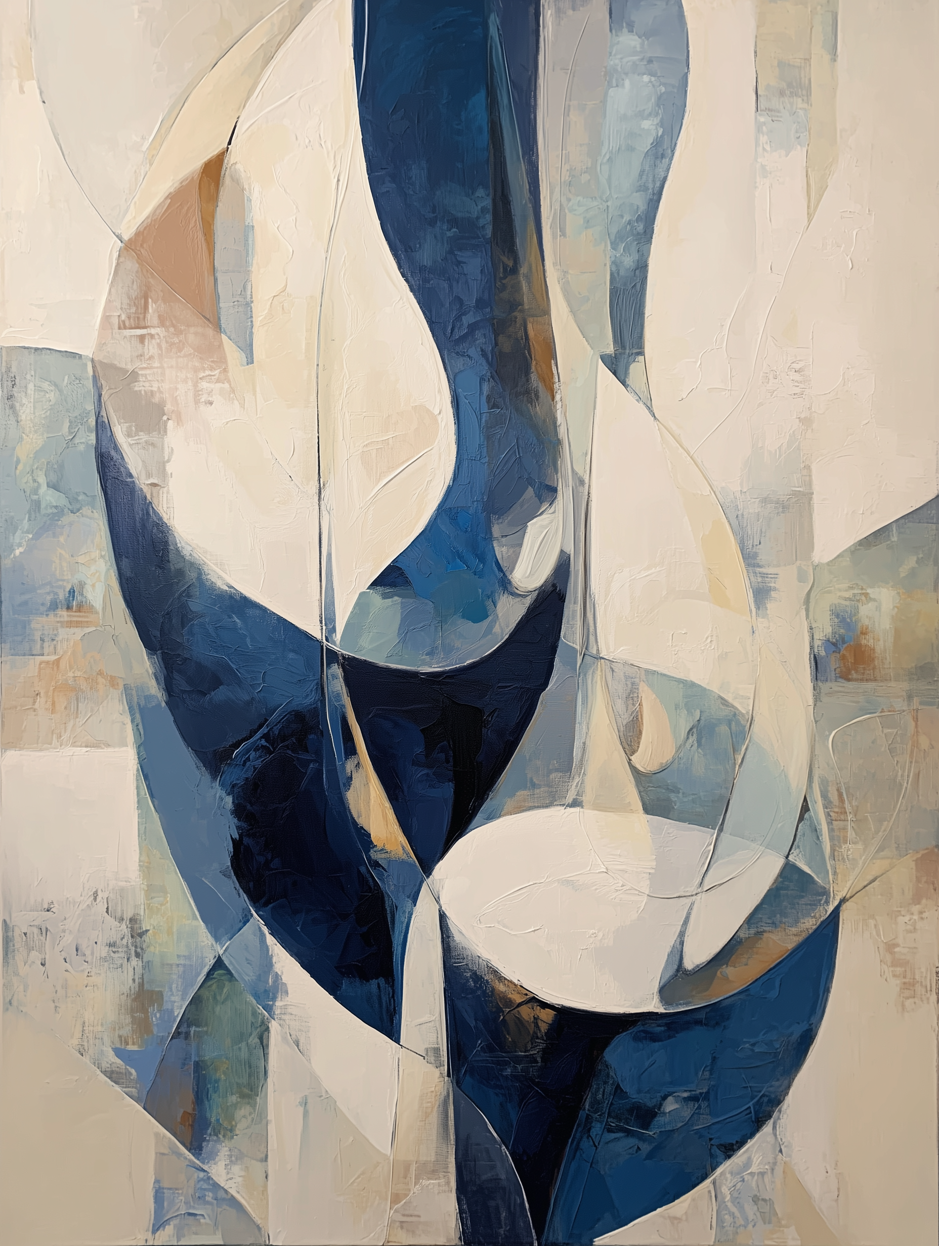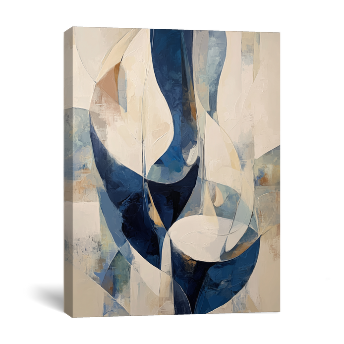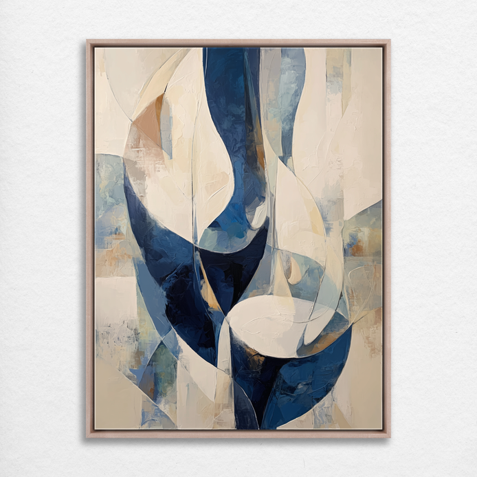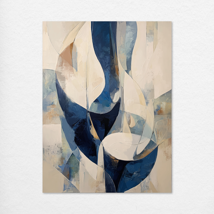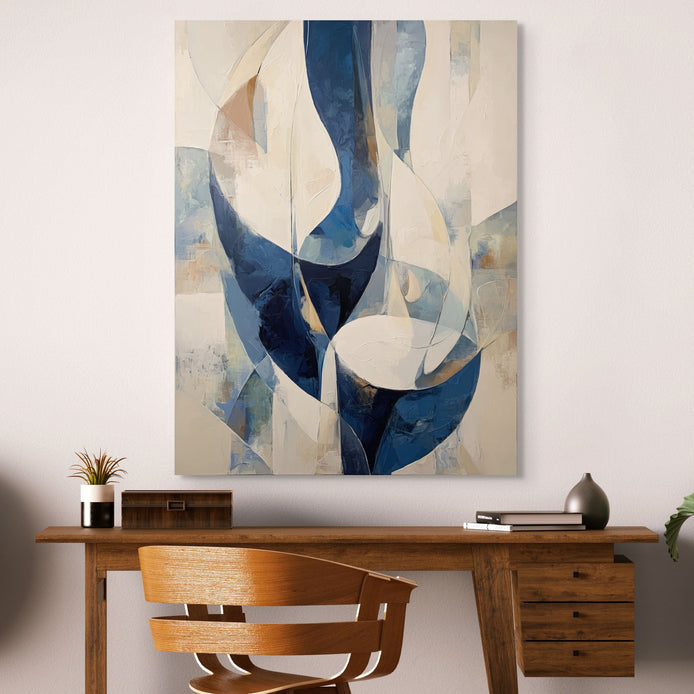 This artwork features flowing forms in varying shades of blue and white. It showcases a modern design with intersecting shapes that invites conversation. A striking choice for any wall art collection. Ideal for decorating living rooms, bedrooms, dining areas, hallways, or offices, and a perfect choice for stylish home decor or a meaningful gift.