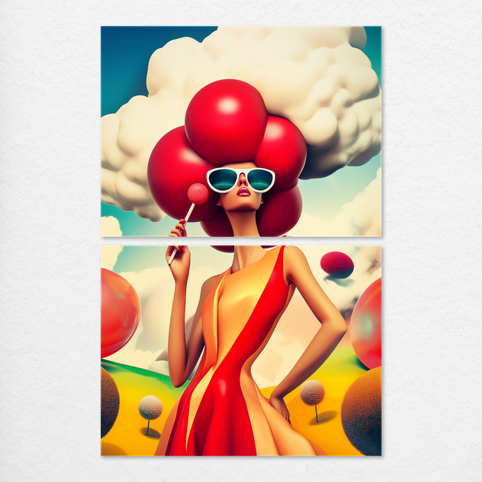 This surreal composition blends fashion and fantasy, bursting with imaginative flair. The maximalist design uses bold reds and whimsy to create a dramatic visual statement, making it an ideal choice for energizing a living room, bedroom, or sophisticated man cave.