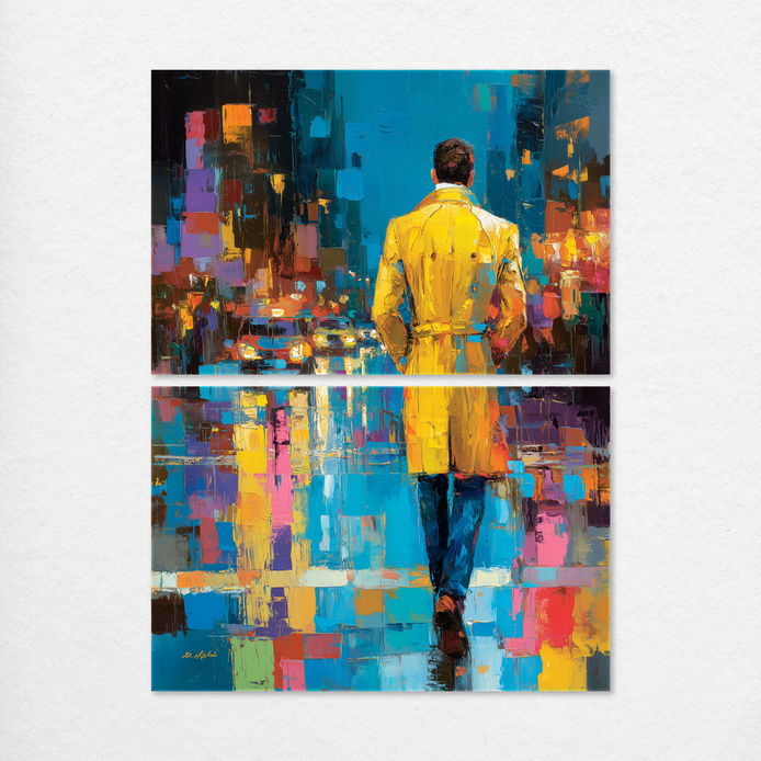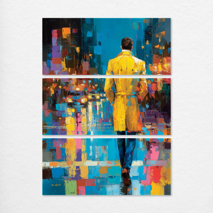 This hand-painted wall art captures a fashionable figure adorned in a striking yellow coat, strolling through a dynamic city at night.