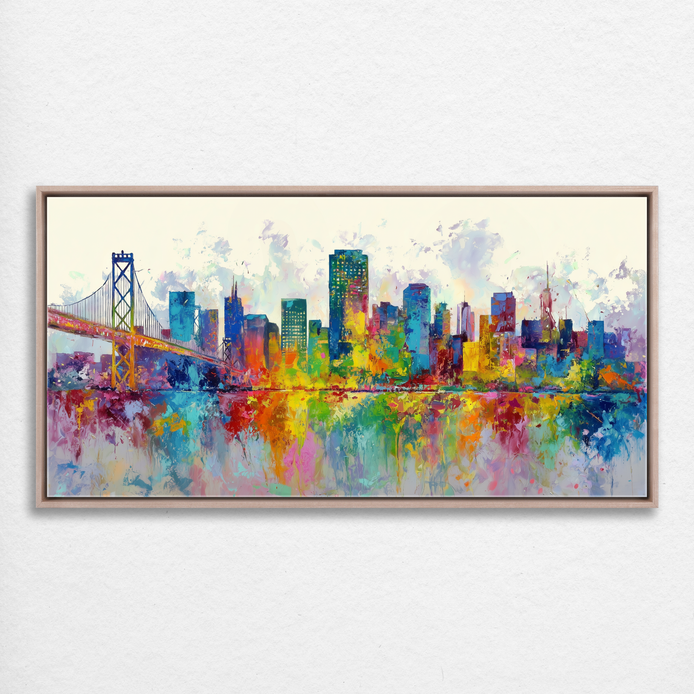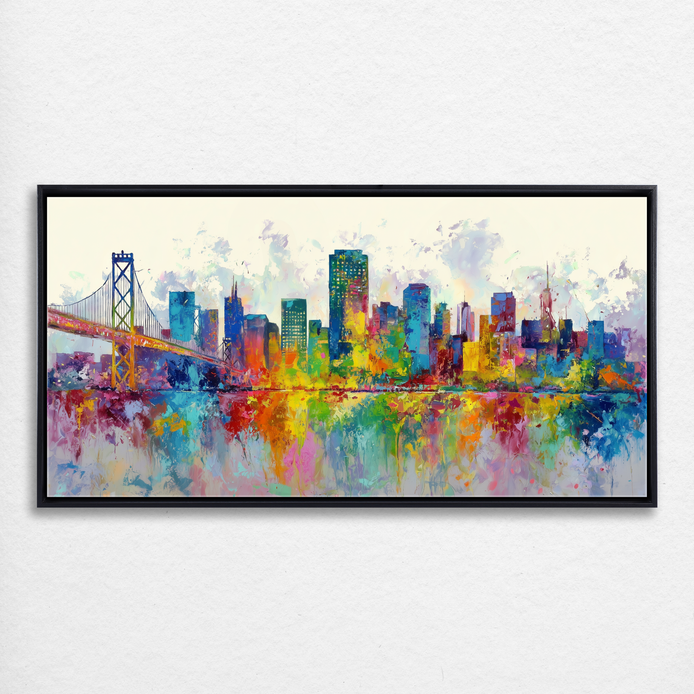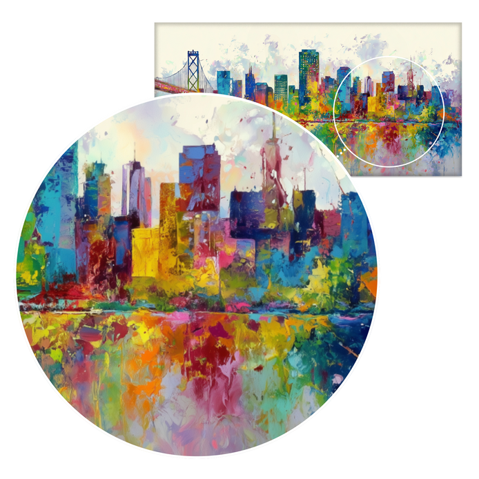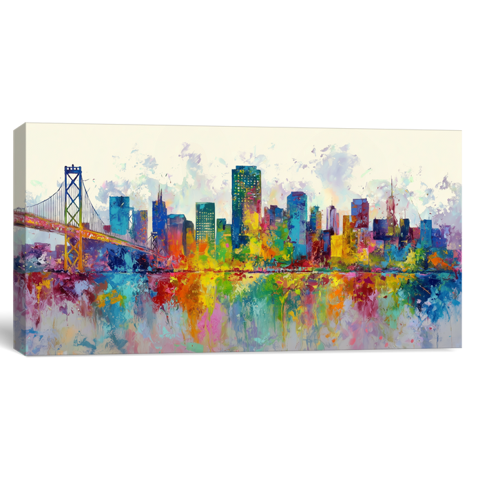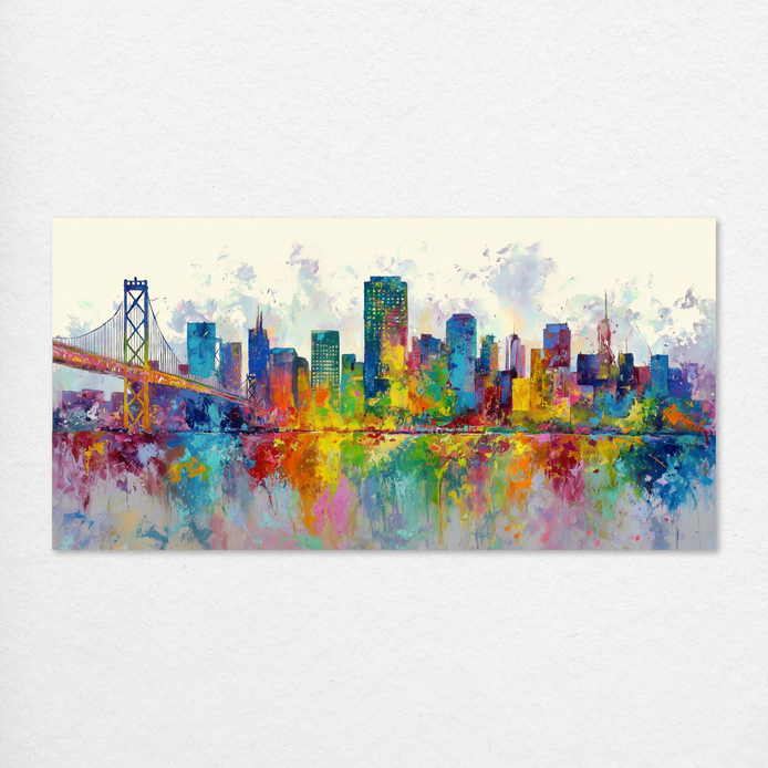 This lively urban scene captures the city's unbridled energy through a colorful skyline and bridge. The impressionist composition features bright, bold hues and expressive color fields. This piece is an ideal decorative statement for living rooms, offices, or dining areas.