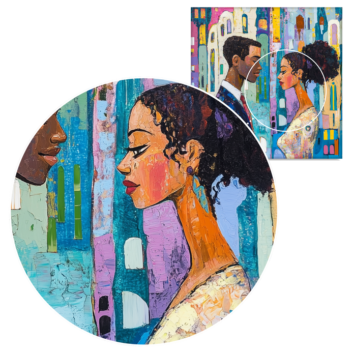 This hand-painted scene captures an intimate moment between two figures against a cityscape of bold, colorful textures and shapes. The nuanced expressions and striking palette convey both connection and individuality, creating a modern-day portrait of love.