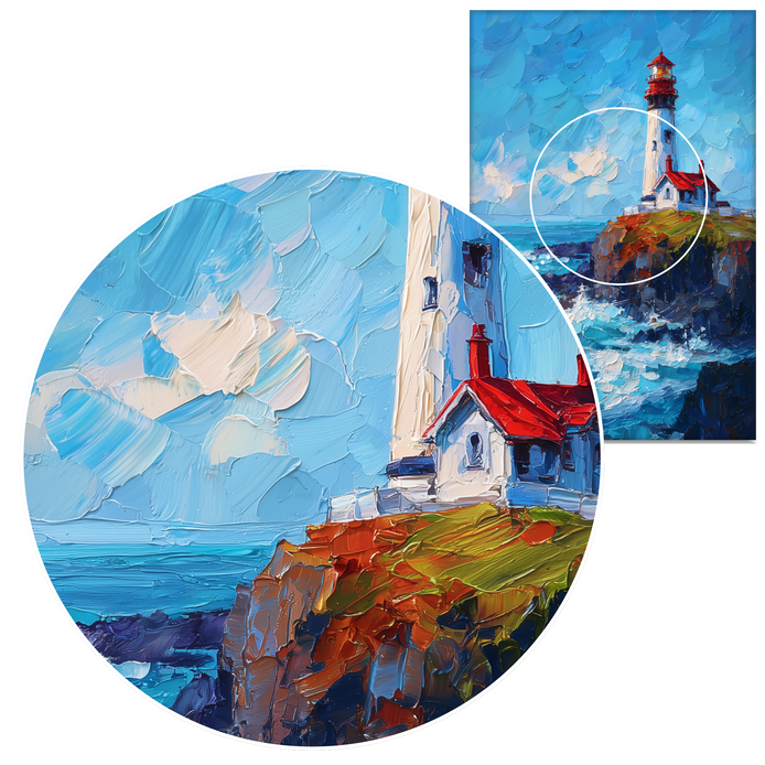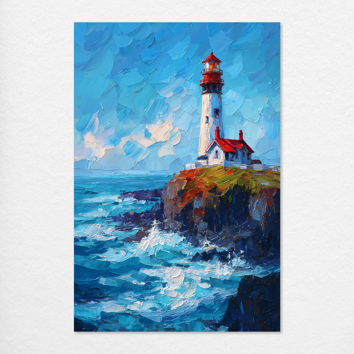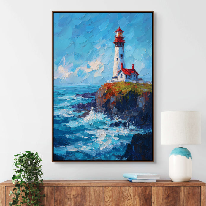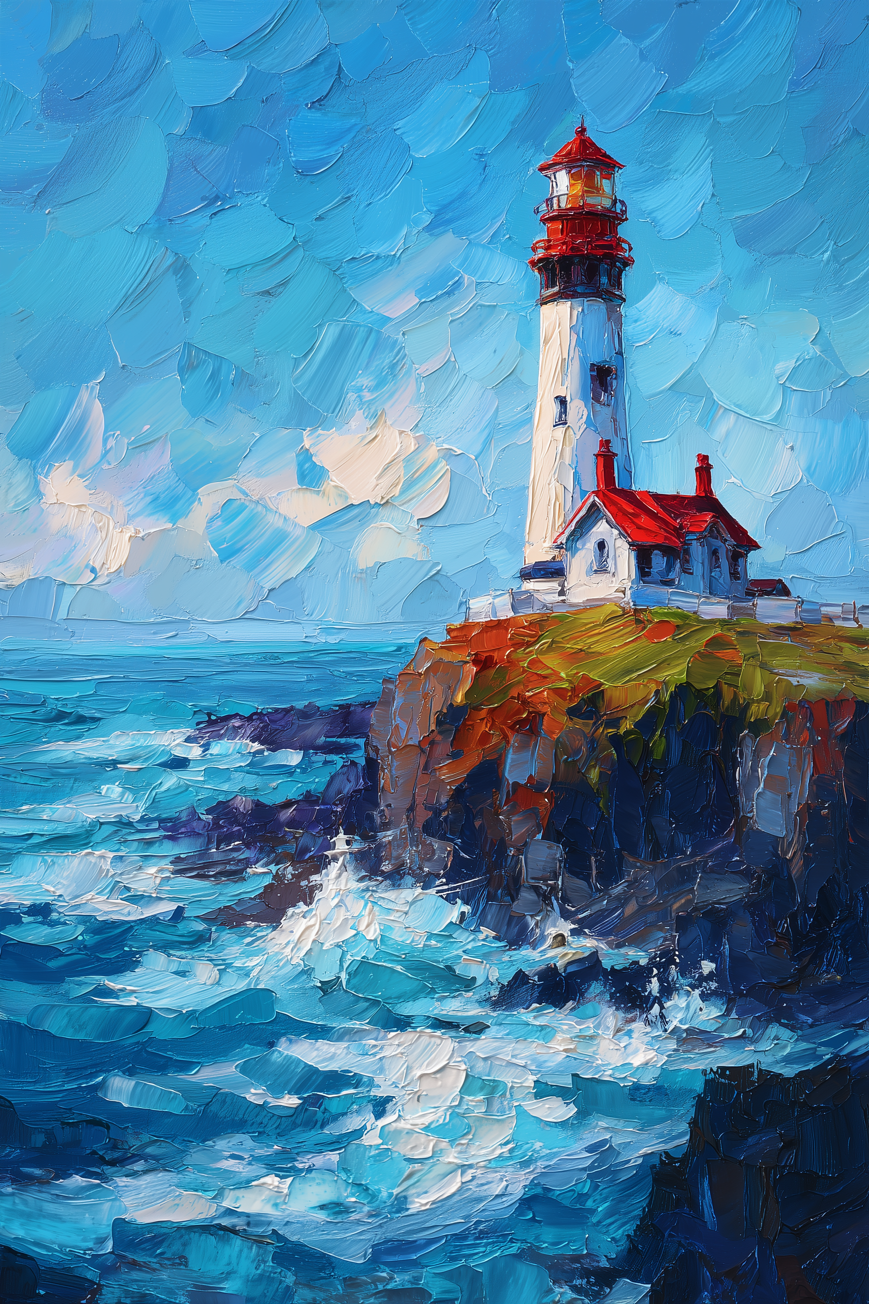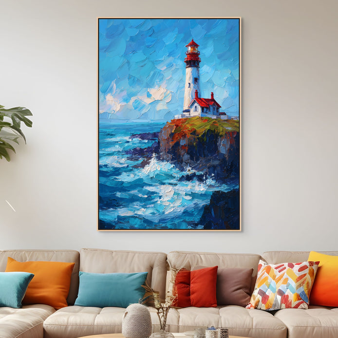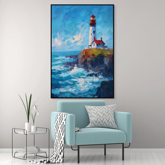 This hand-painted wall art showcases a stunning lighthouse standing tall on rocky cliffs, illuminated by bright colors. The waves crash against the shore, creating a lively coastal atmosphere.