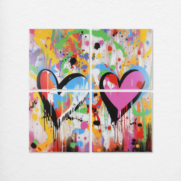 Two radiant hearts intertwine against a vivid splash of color, conveying a mood of celebratory connection and pure joy. This maximalist composition features bold forms and a dynamic background defined by vibrant hues. It is an ideal decorative statement for living rooms, bedrooms, or patio spaces.