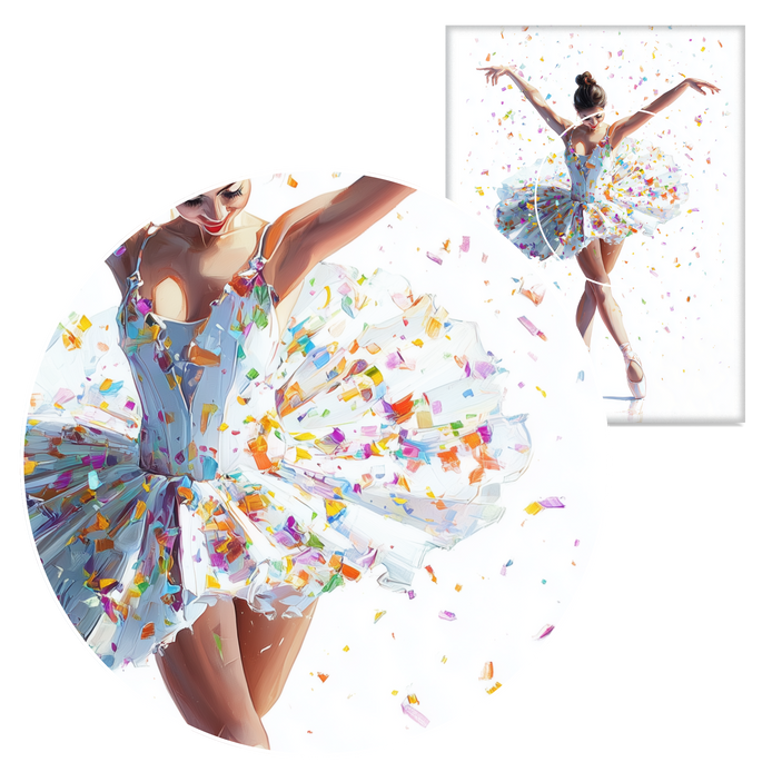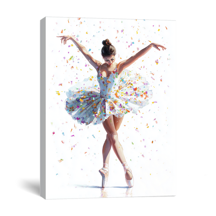 Experience the beauty of hand-painted wall art featuring a ballet dancer in a vibrant tutu, surrounded by colorful confetti. This original artwork captures grace and poise.