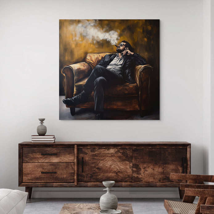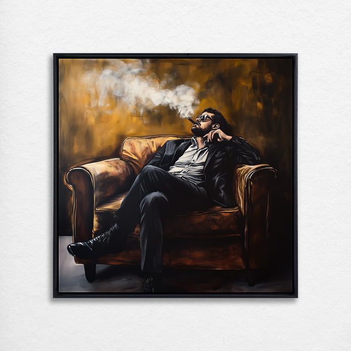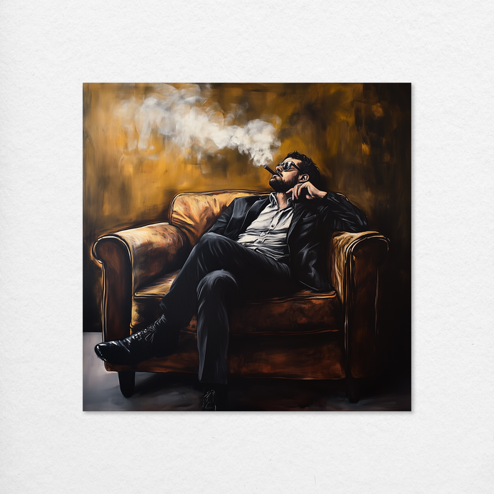 Exuding elegance and poise, this composition captures a moment of introspection and leisure. The rich, warm tones emphasize a sense of power and refinement.