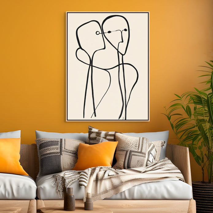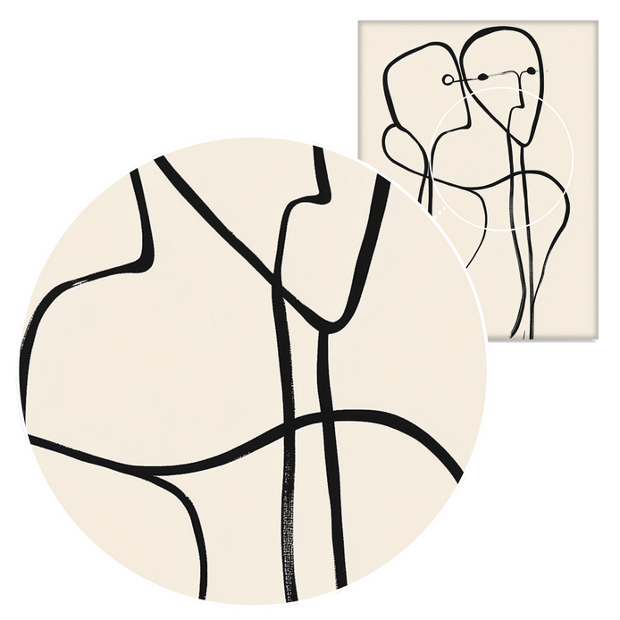 Two abstract figures share a single thread of thought in this modern hand-painted line artwork. A soulful addition to contemporary or gallery-style walls.