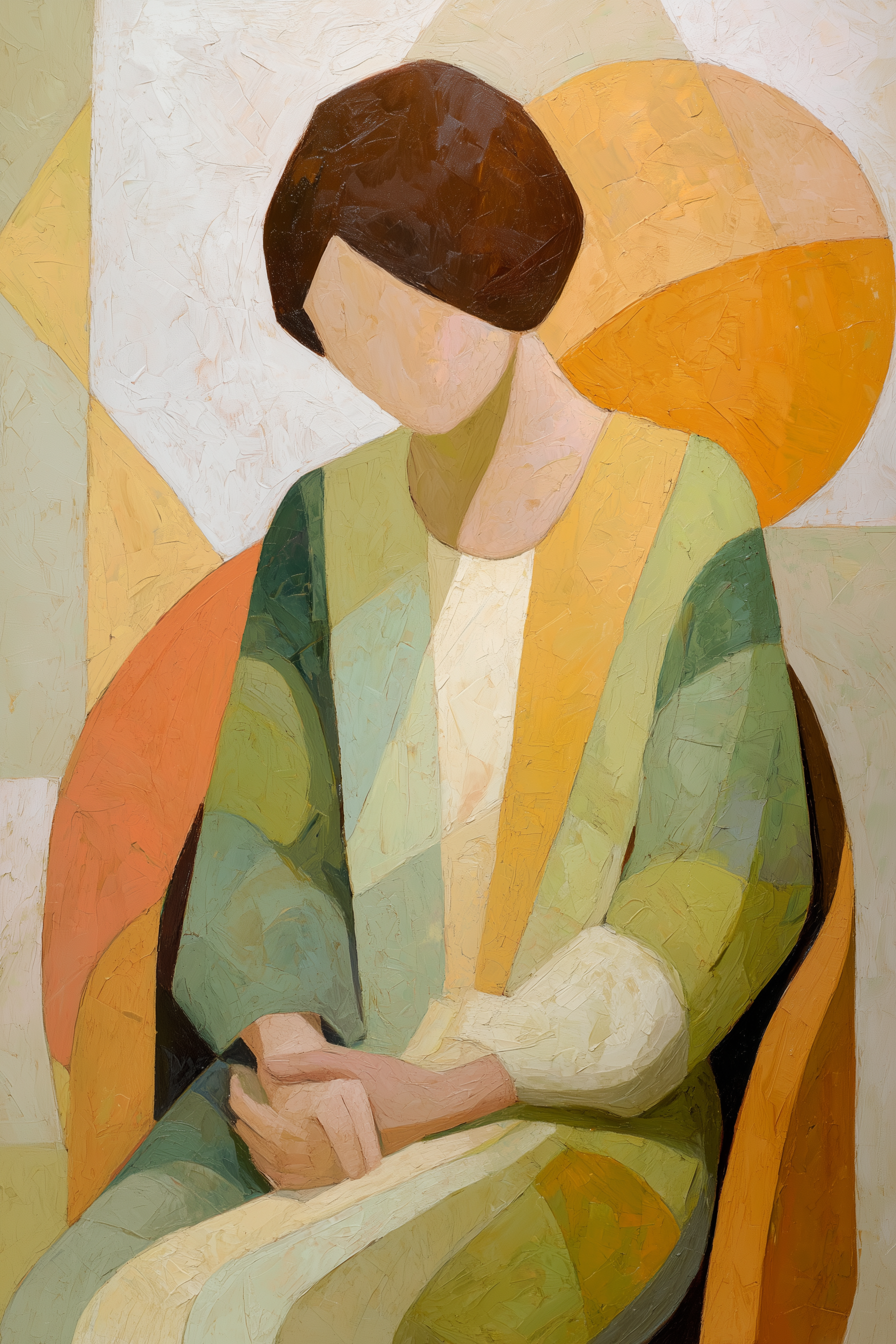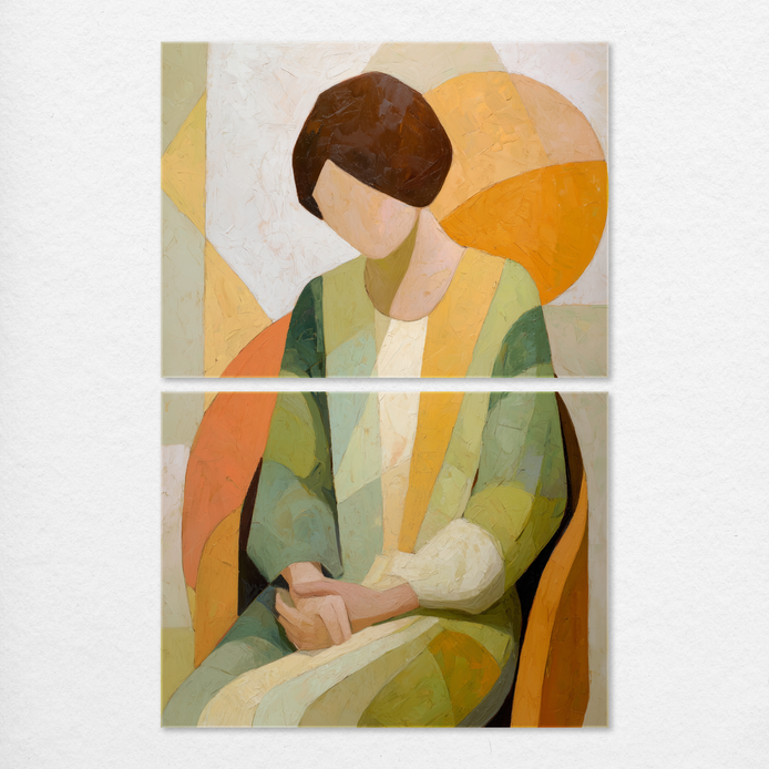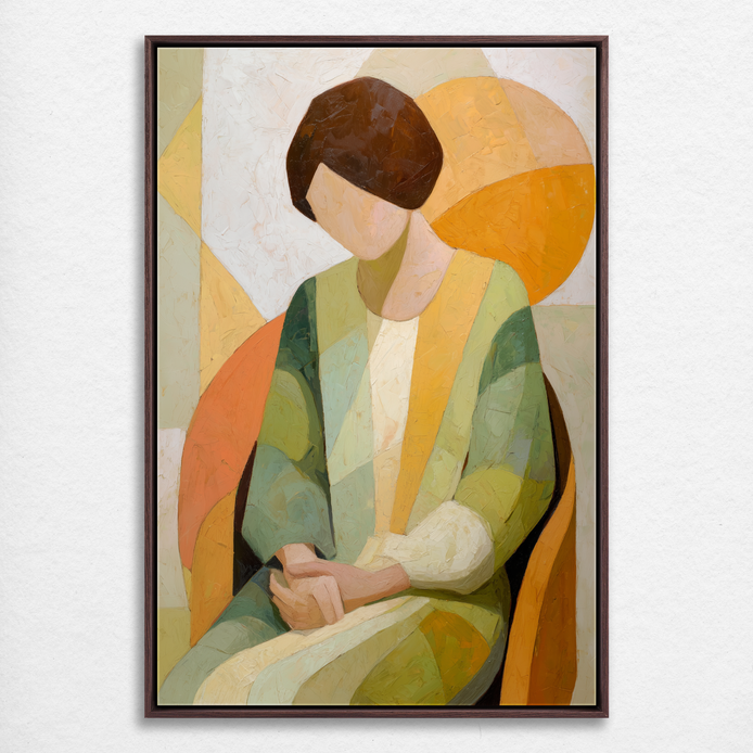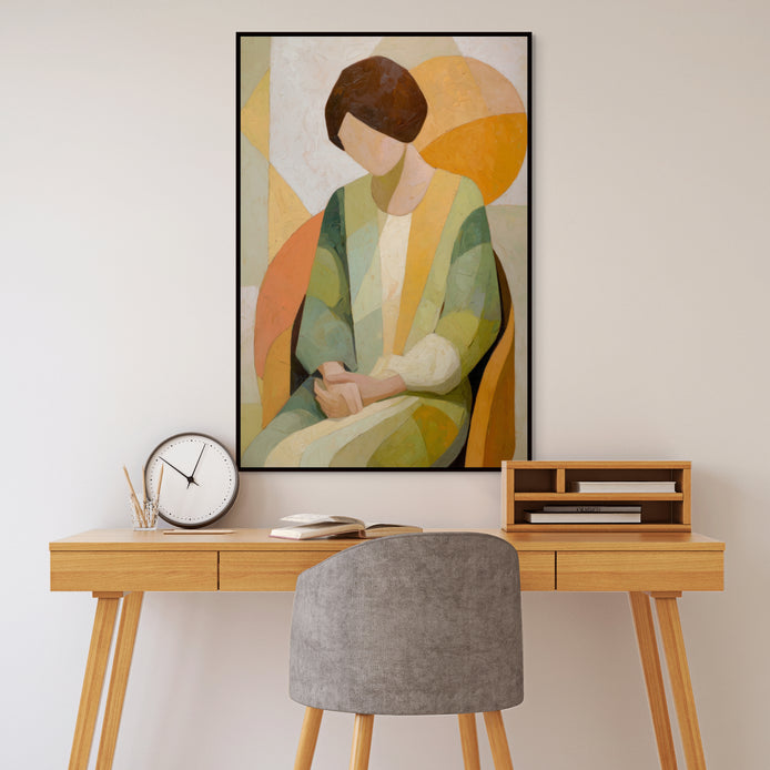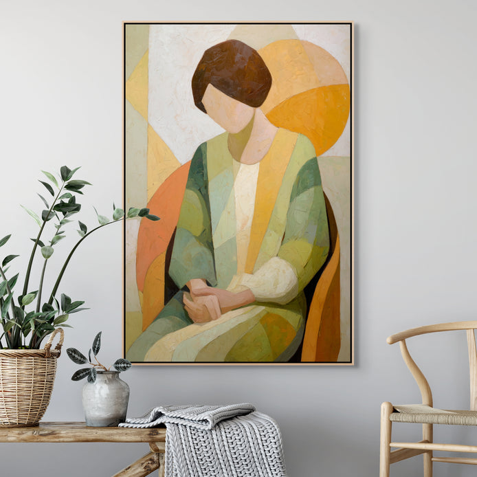 This hand-painted wall art features a tranquil woman seated against a backdrop of soft geometric shapes in muted colors.