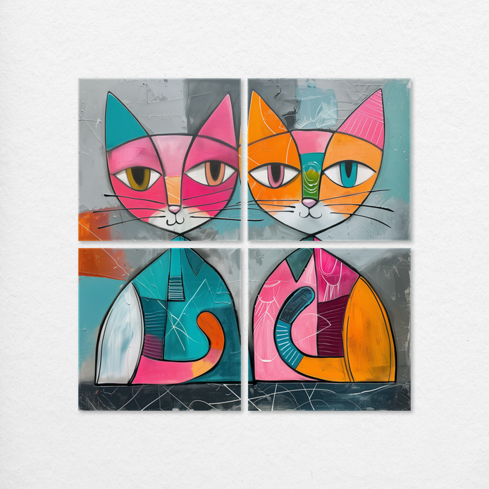 Two abstract feline figures radiate a charming and inquisitive modern mood. The composition utilizes striking geometric designs and a maximalist blend of vivid colors and stylized shapes for a delightful visual twist. This playful statement piece is an ideal accent for living rooms, bedrooms, or children's spaces.