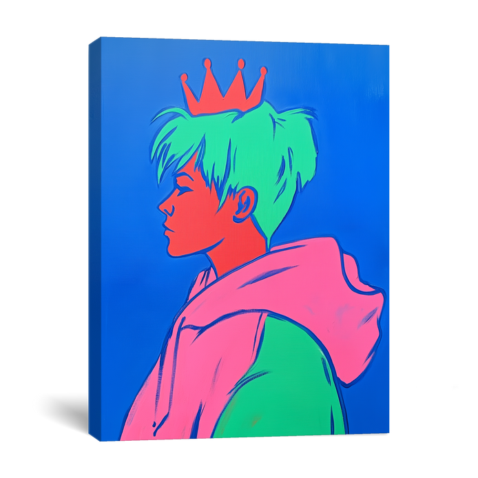 Hand-painted wall art showcases a lively portrait of a youthful figure crowned with color, radiating boldness and individuality.