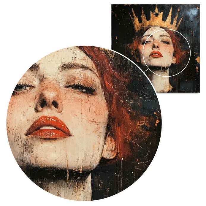 This striking portrait conveys regal strength and mythical beauty through a crowned figure with a commanding gaze and fiery red hair, embodying themes of power and vulnerability. Weathered textures and gold accents blend to create an ethereal composition with sophisticated visual depth. This centerpiece is ideal for decorating living rooms, offices, or high-traffic areas, serving as a powerful focal point.