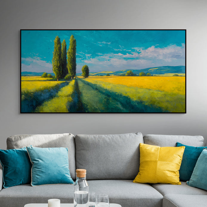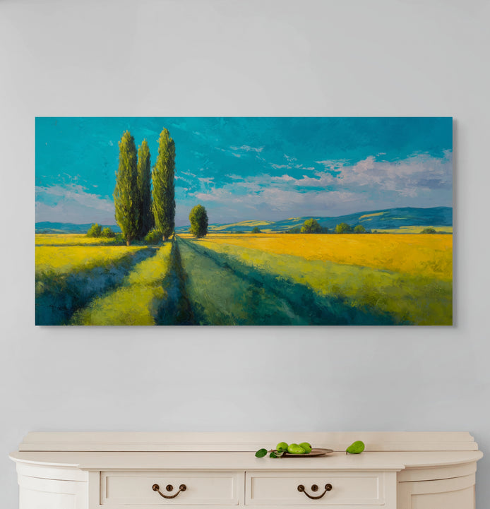 This stunning landscape captures a mood of serene, sun-drenched majesty with its composition of tall trees and expansive fields. The visual features rich golden hues juxtaposed against a vivid blue sky, creating a vibrant, classic atmosphere. It serves as an elegant focal point for living rooms, bedrooms, or professional office spaces.