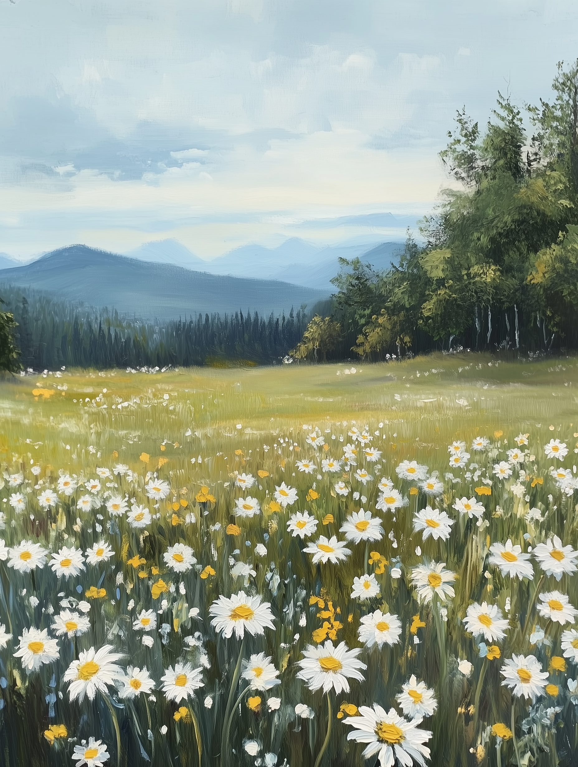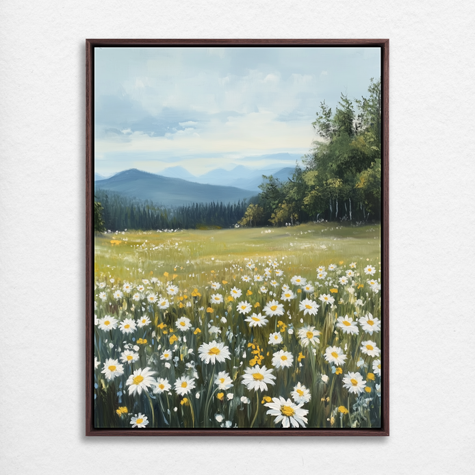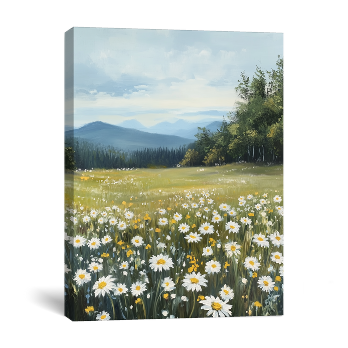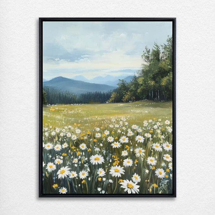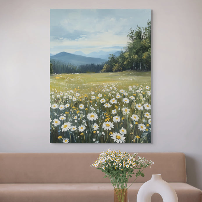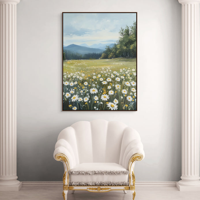 This hand-painted wall art showcases a breathtaking daisy field in full bloom, framed by distant mountains and a gentle sky. The piece radiates tranquility and natural beauty.