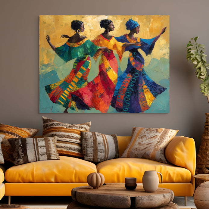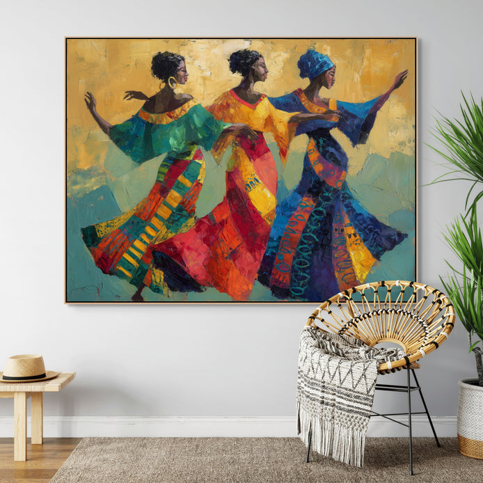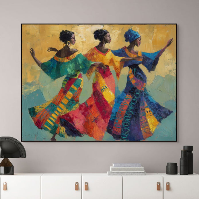 This hand-painted wall art features three graceful women in bright, flowing dresses, embodying movement and joy.