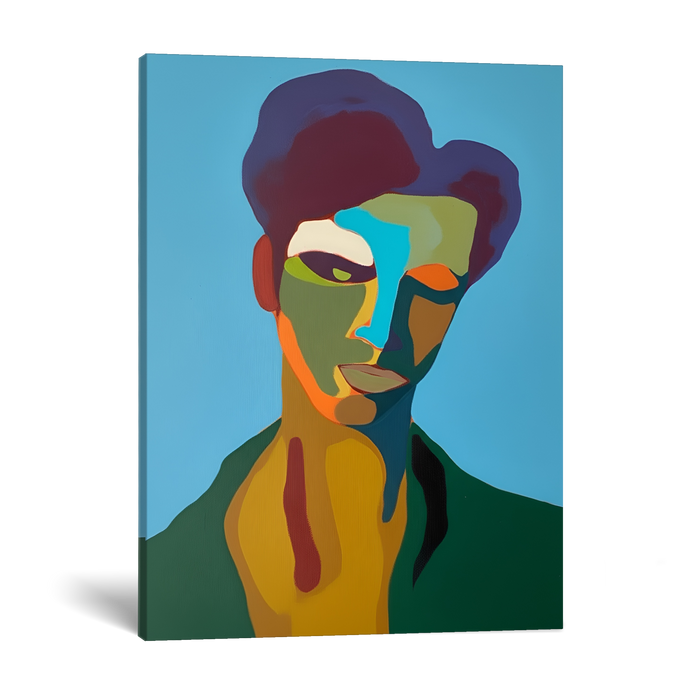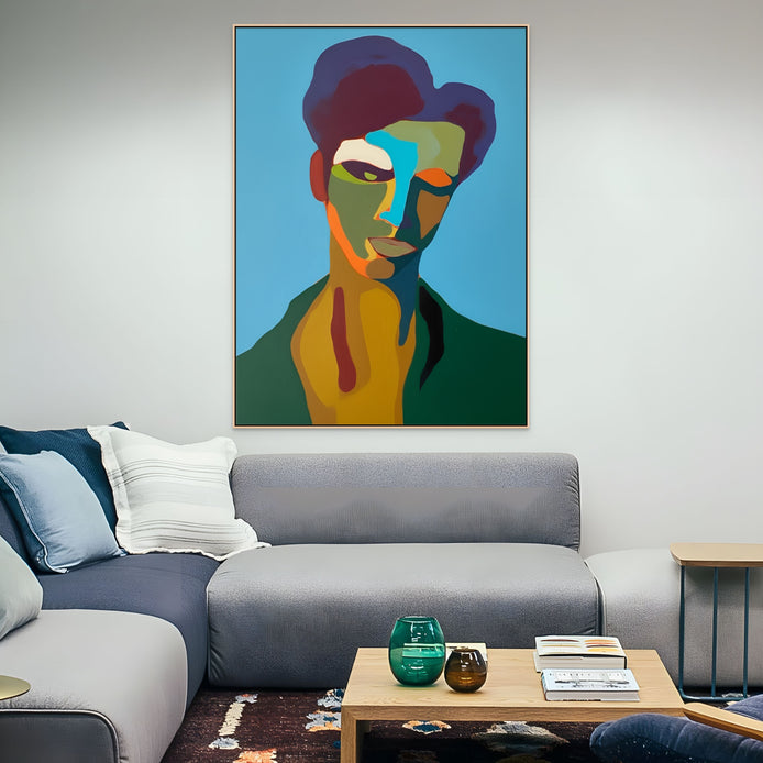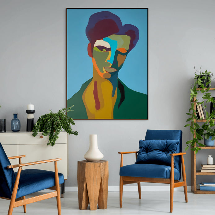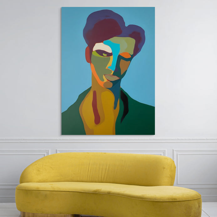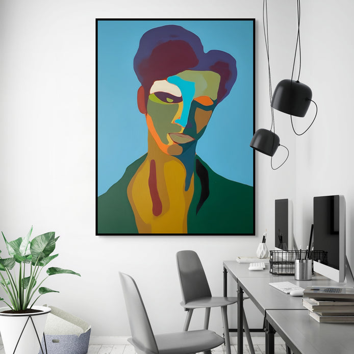 This striking abstract portrait commands attention, radiating a bold and dynamic mood. The composition features a vivid palette and energetic, fluid shapes, defining a modern aesthetic. It is an ideal statement piece for living rooms, bedrooms, dining areas, hallways, or offices.