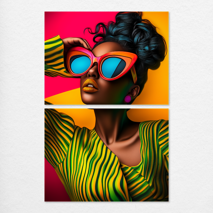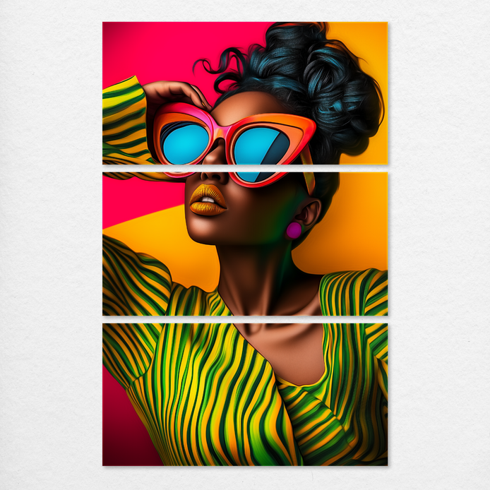 This bold portrait features a powerful woman, conveying an expressive mood of celebrated personal style. Saturated colors and dynamic forms define the maximalist composition. This striking visual statement is ideal for energizing living rooms, bedrooms, dining areas, hallways, or man caves.