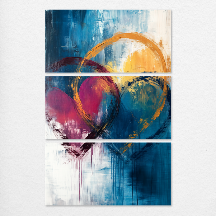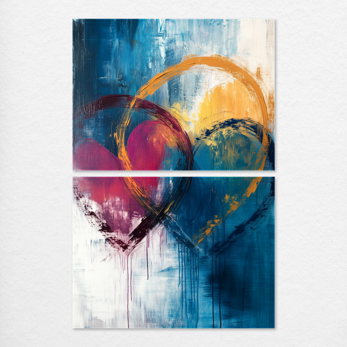 Bold strokes and vibrant hues intertwine, forming two abstract hearts in a hand-painted display of passion and connection. The expressive drips and dynamic textures add emotional depth.