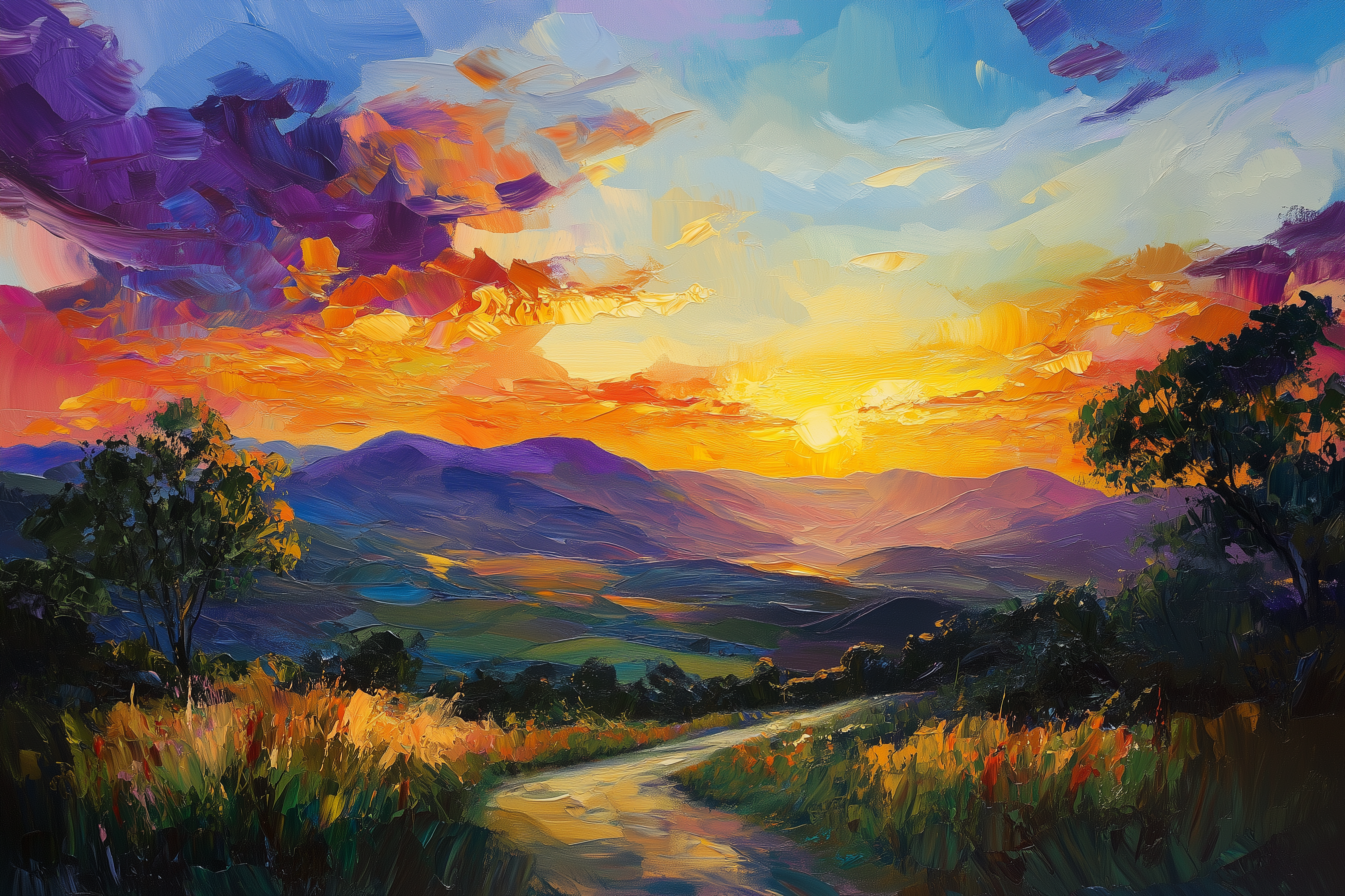 This hand-painted wall art captures a vibrant sunset with swirling colors of orange and purple over rolling hills. The sun sets in a dramatic sky, reflecting nature's beauty.
