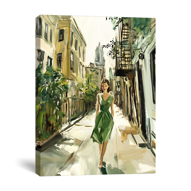 This dynamic urban escape conveys the energetic pulse of a bustling city blended with the tranquility of nature. Its maximalist composition features vibrant greens and bold forms. This sophisticated piece is ideal for energizing living rooms, bedrooms, or office spaces.