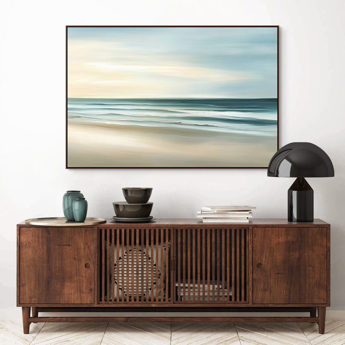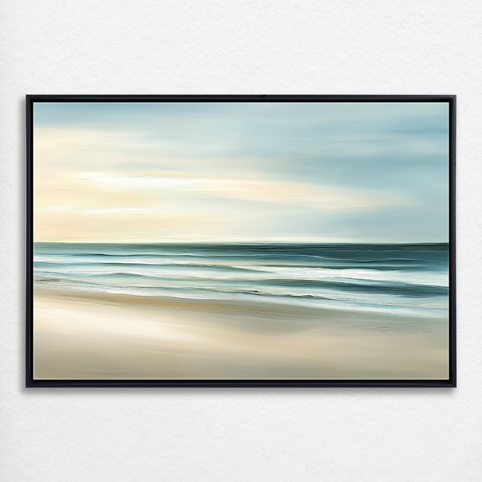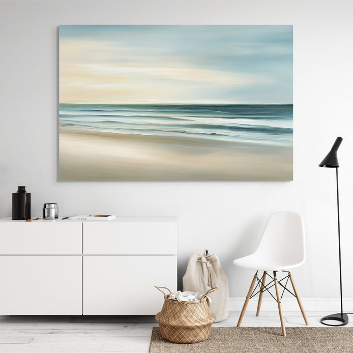 Gentle ocean waves meet golden sands at sunrise, establishing a calming, serene effect. The composition blends soft blues and warm hues for a tranquil coastal aesthetic. This piece is ideal for decorating living rooms, bedrooms, or bathrooms.
