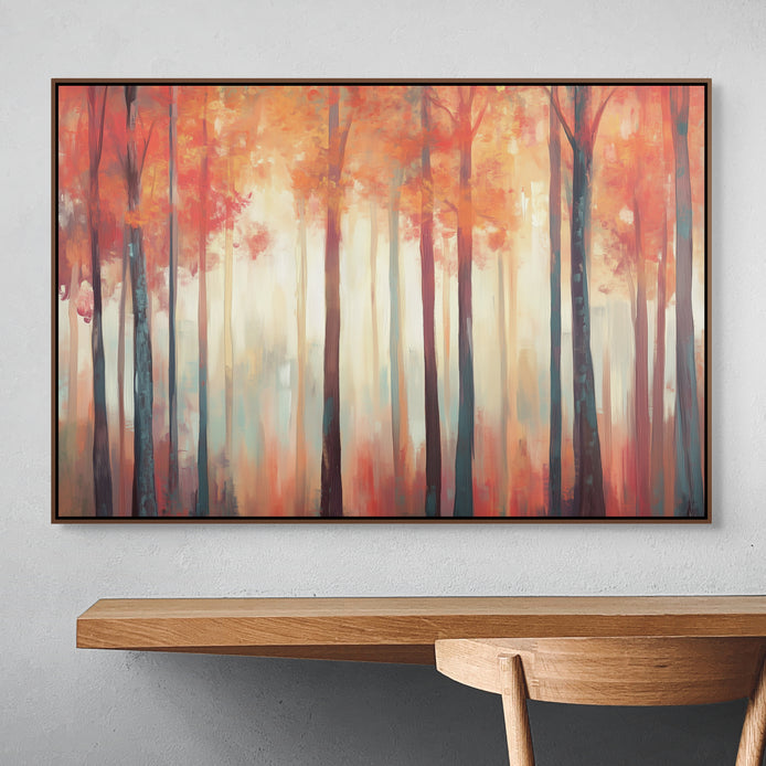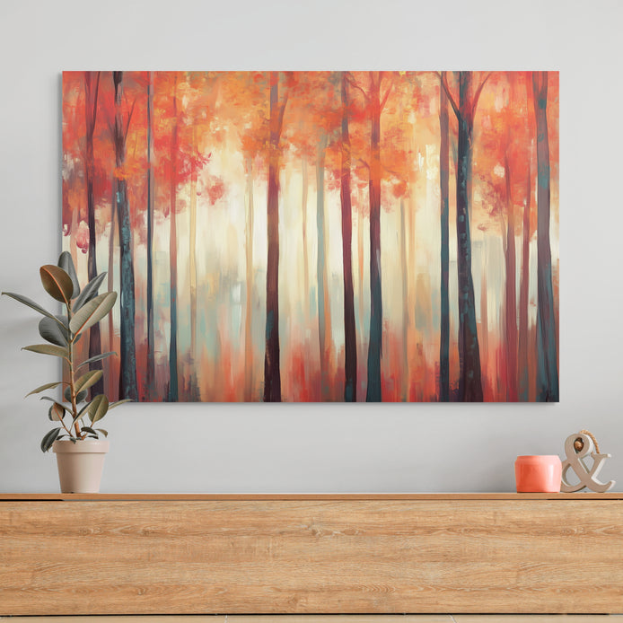 This hand-painted wall art showcases a lively autumn forest with tall trees adorned in warm hues of orange and red. The captivating scene captures the essence of nature's transformation.