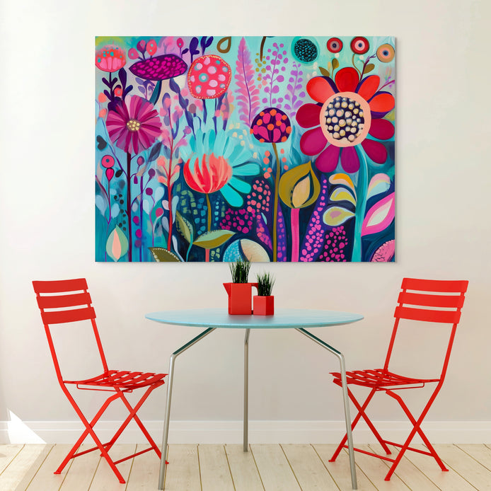 Bright hues bring life to this hand-painted wall art showcasing a lively array of flowers. The original artwork captures the essence of nature with an imaginative touch.