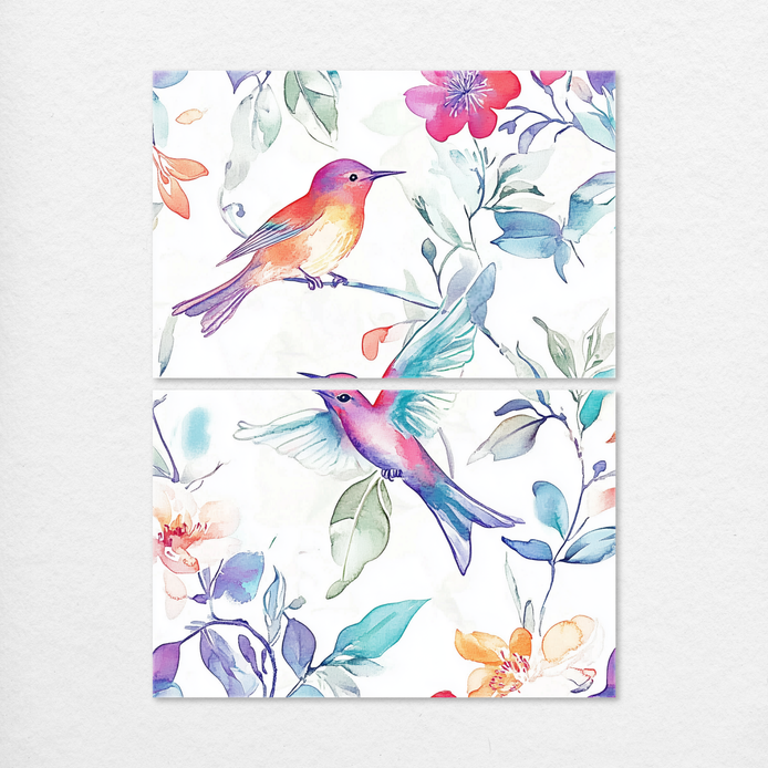 Two colorful birds create a visual hook of joy and natural elegance amidst a lush backdrop of delicate flora, conveying a cheerful, serene mood. The composition features vibrant colors and detailed forms in a maximalist style. This captivating piece is ideal for adding stylish charm to living rooms, bedrooms, dining areas, hallways, or kitchens.