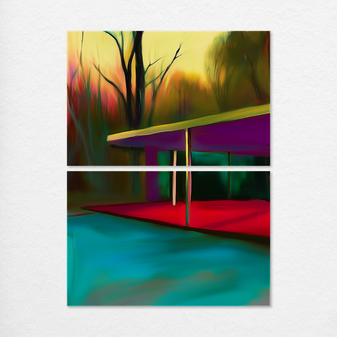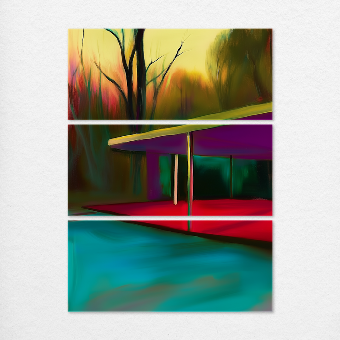 A tranquil outdoor structure is set against a vibrant backdrop, evoking a mood of serene contrast and bold energy. The composition features rich, saturated colors in a maximalist style, defining the trees and sky. This visual is an ideal statement for living rooms, offices, or dining areas.