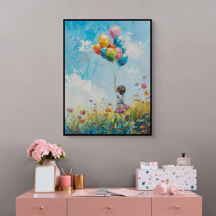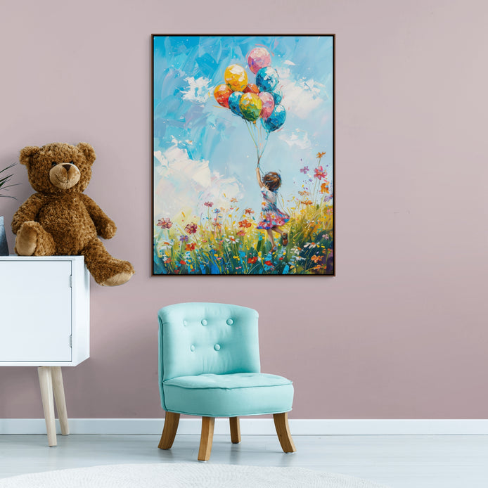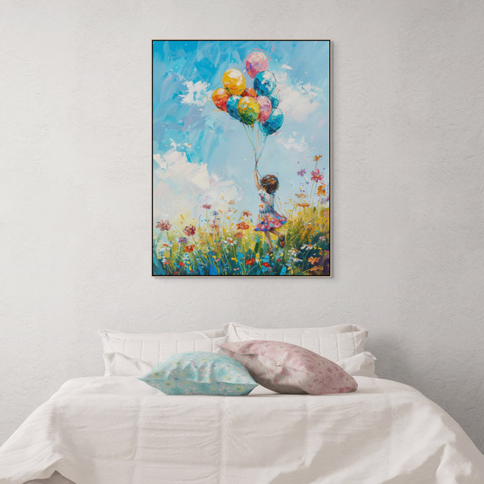 This joyful hand-painted scene captures a child with balloons running through a wildflower meadow. Bold brushstrokes and colors express boundless energy.