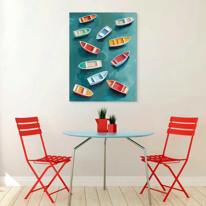 Discover this vibrant hand-painted wall art showcasing colorful boats drifting gently in tranquil blue waters. This unique piece brings joy and color to any space, perfect for art enthusiasts.