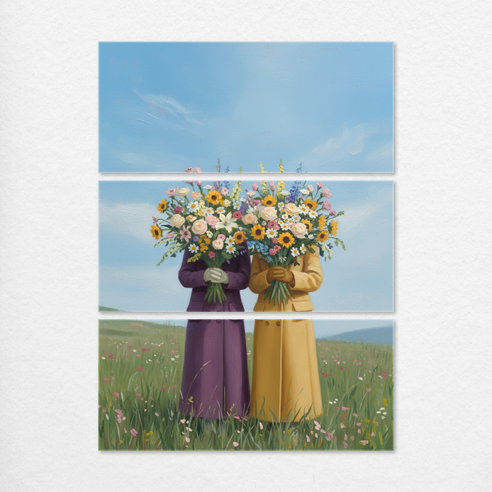 Two joyful figures holding vibrant bouquets define a spirited and charming mood. The composition sets bold, colorful coats and maximalist florals against a serene blue sky and lush green field. This visual is ideal for energizing living rooms, bedrooms, or patio spaces.