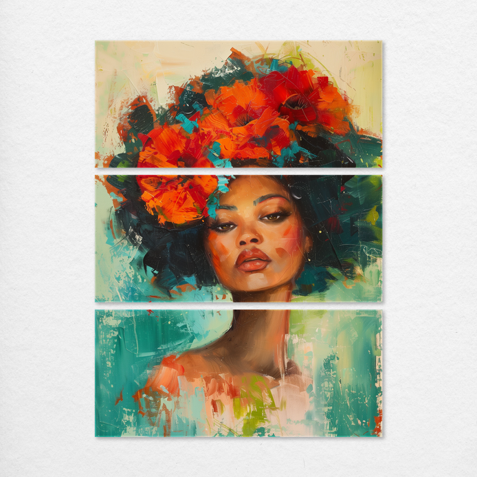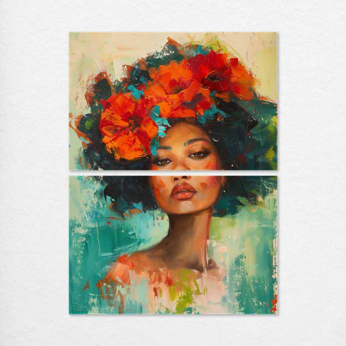 This bold portrait of a woman adorned with vibrant red and orange blossoms exudes a mood of untamed strength and grace. The sophisticated composition features a lush teal background that richly contrasts with the vivid floral colors. This compelling centerpiece is ideal for adding dramatic flair to a living room, bedroom, or man cave.